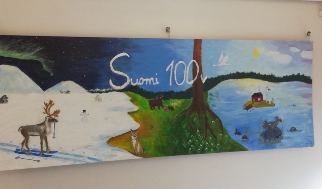 Luontoaihe oli tärkeä Luumäellä kokoontuvien taiteen perusopetuksen opiskelijoille. Keskustellessaan suomalaisuudesta 7-9 -luokkalaiset nuoret nostivat esille Suomen eläimet ja vuodenajat. Kevään aikana nuoret toteuttivat yhdessä projektityön, jossa huomioitiin sekä kulttuurinen että ekologinen kestävä kehitys. Vanhan kirjahyllyn taustalevy sai uuden tehtävän maalauksen taustana. Valmiista akryylimaalauksesta on löydettävissä runsaasti mielenkiintoisia ja hauskoja yksityiskohtia Suomesta.