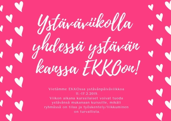 Ystävänpäiväviikolla 11. – 17.2.2019 EKKO tarjoaa opiskelijoilleen ystävälahjaksi mahdollisuuden tuoda ystävä tutustumaan kurssille. Tule ompelemaan, opiskelemaan vierasta kieltä tai vaikka venyttelemään yhdessä ystävän kanssa!